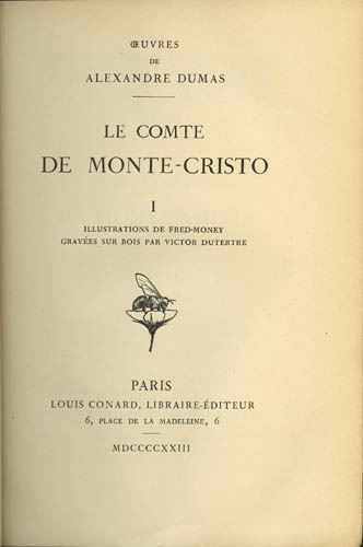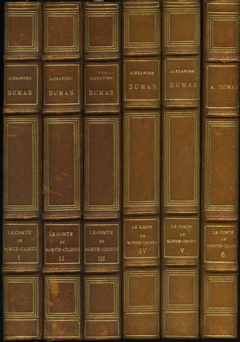Dumas, Alexandre, Le Comte de Monte-Cristo ("The Count of Monte Cristo"), written in 1846, this edition was printed in 1923, luxuriously bound in quarter leather with marbled end plates, gilded pages and page ribbons, 6 volumes in octavo, 2034 pages, with wood-cut illustrations in black & white by Fred-Money. The text is Dumas's original, in French (mais bien sur en français!). In good condition for its age, we note only a few minor scuffs to the binding and some end pages are a bit toned, a handsome set overall. This set will look lovely on a serious book collector's library shelf and the books are quite readable. Shipping weight 10 lbs / 4.55 kilos. Estimate $75 - 100.