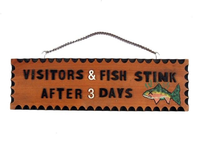 Dumb And Dumber To Fish Stink Sign Prop - One of the true delights of 2014 was the release of "Dumb and Dumber To", brining Jim Carrey and Jeff Daniels Lloyd and Harry back to life! This is a "Visitors & Fish Stink After 3 Days" wood sign used as a background prop in the production. (Approx. 18 1/2" x 4").