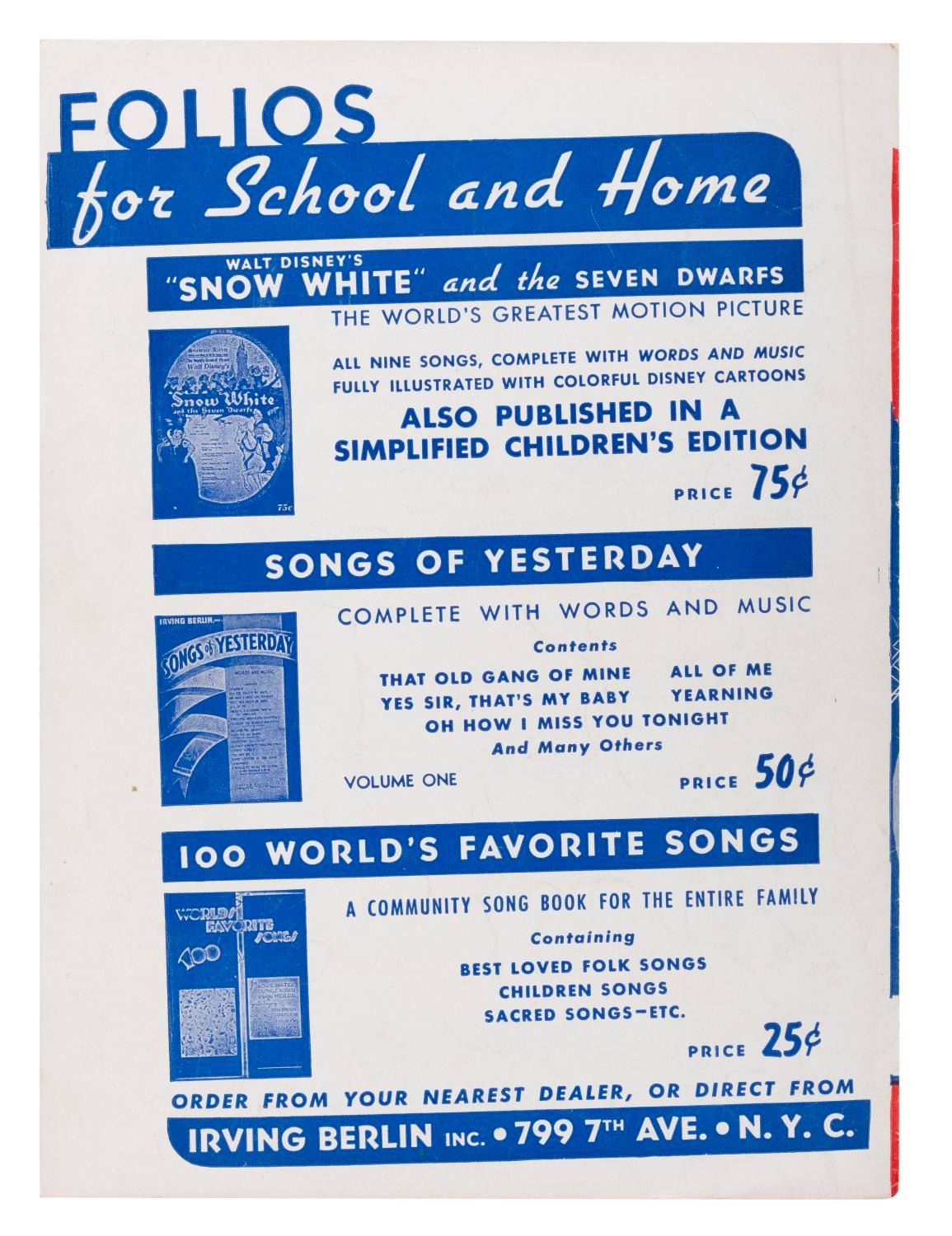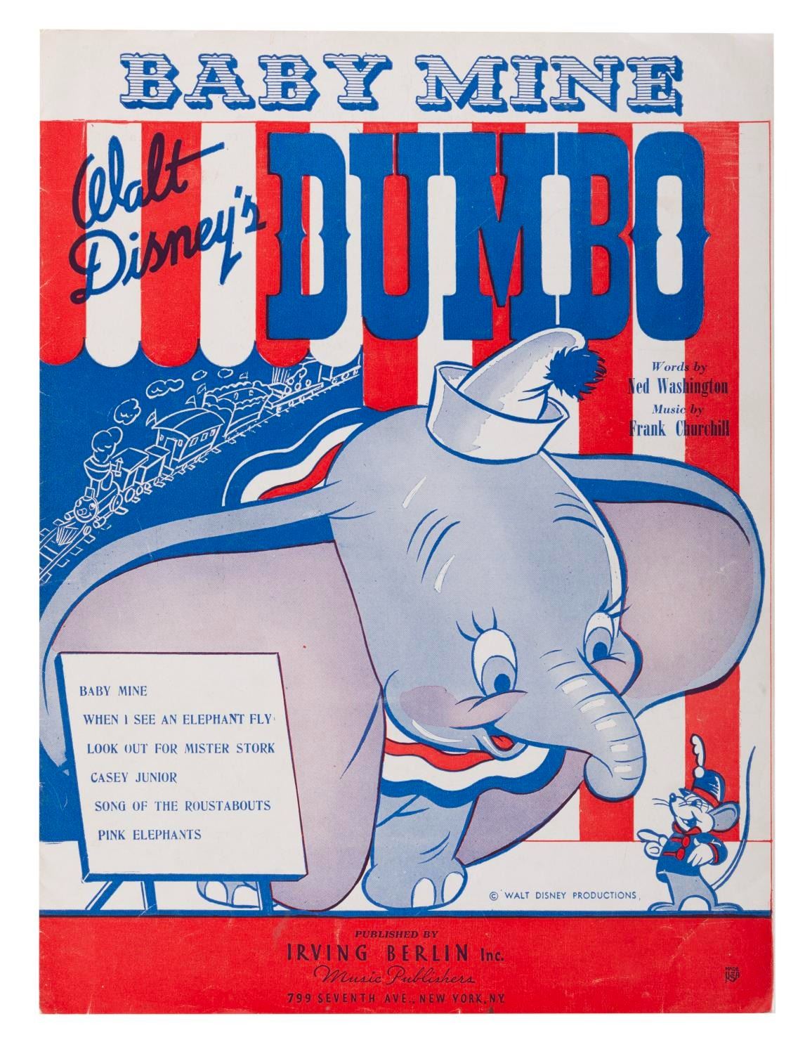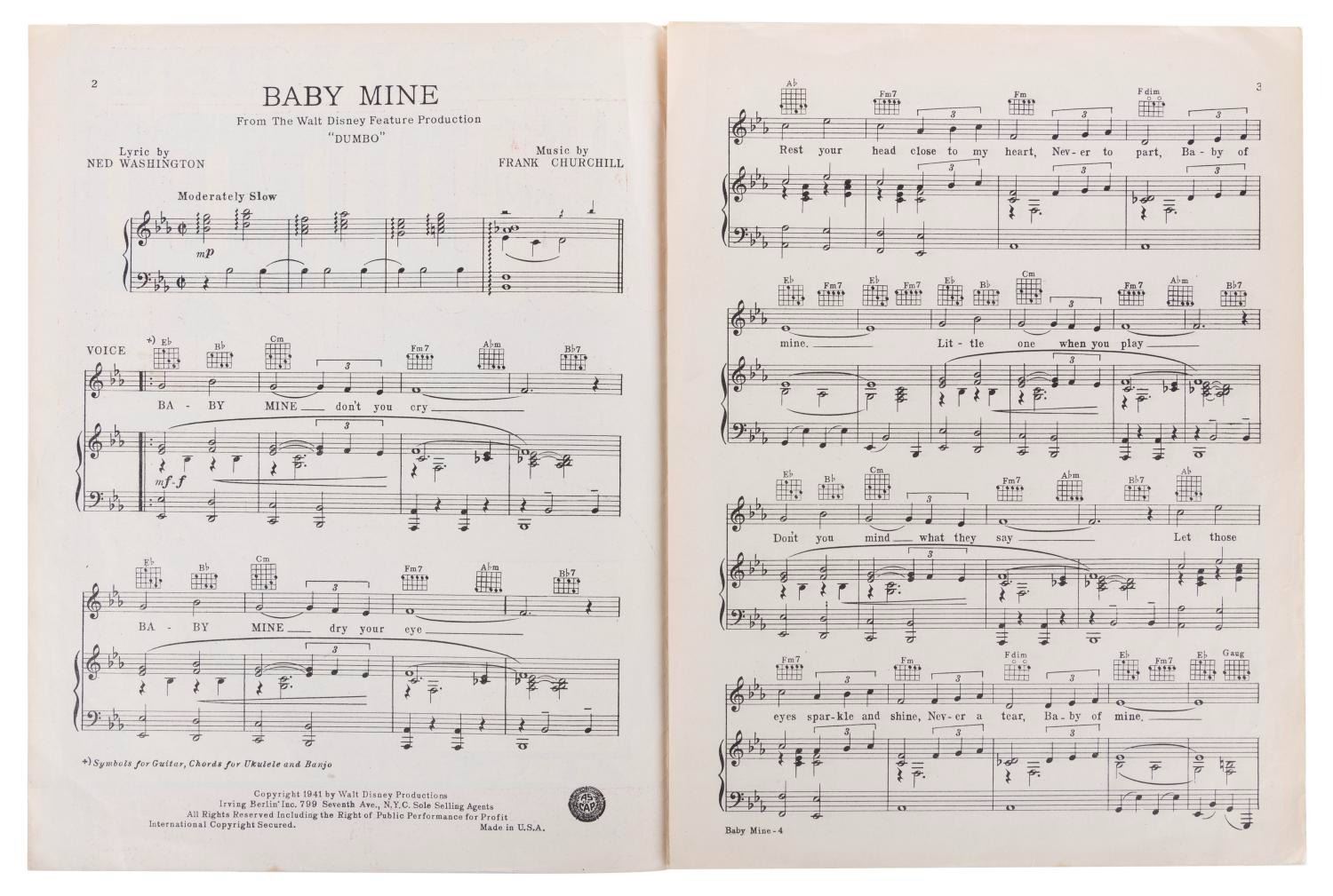 (Disney, 1941) Sheet music of the song Baby Mine from Walt Disney's "Dumbo." Measuring 9.25" x 12.25", the sheet music is in good condition with typical light wear from use.