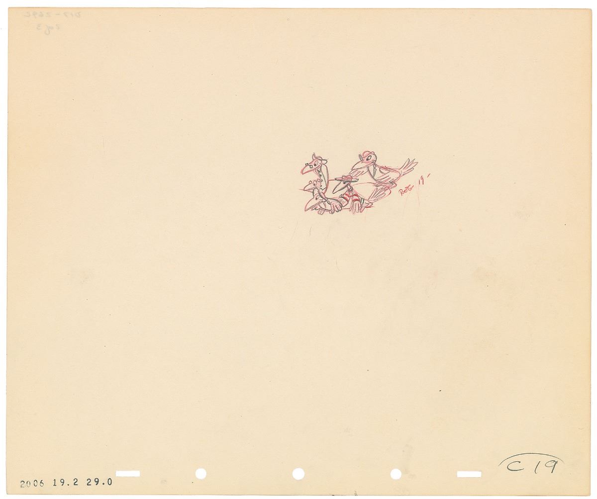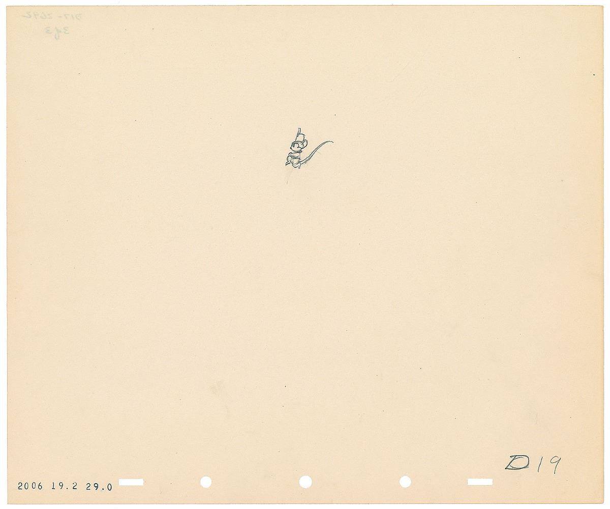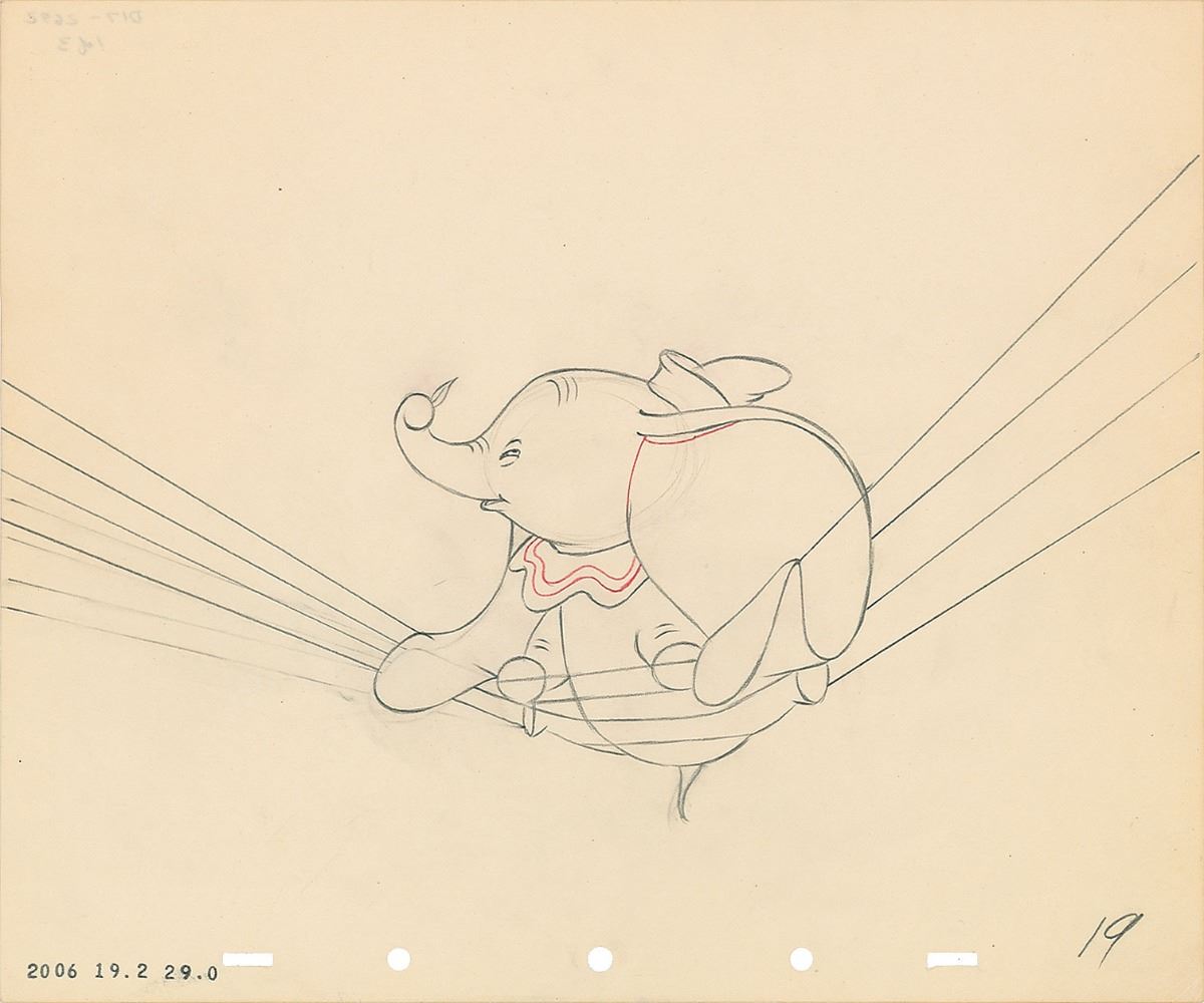 (Walt Disney Studios, 1941) Original matched set of production drawings featuring Dumbo, Crows, and Timothy Mouse from Dumbo, showing Dumbo with the magic feather in his trunk and the other characters positioned above him. Accomplished in graphite and colored pencil on three sheets of untrimmed 12 x 10 animation paper. Character sizes range from .75 x .75 to 4.75 x 5. In fine condition. Production materials featuring Dumbo with the magic feather are scarce and desirable.