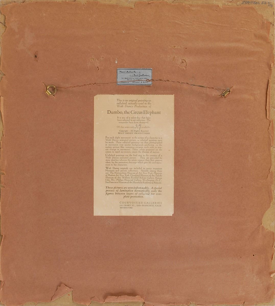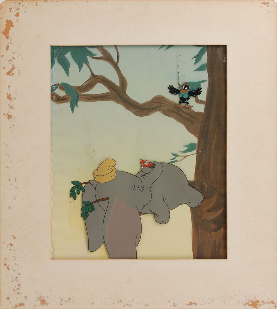 (Walt Disney Studios, 1941) Wonderful original production cel featuring Dumbo, Timothy Mouse, and Joe the Crow from Dumbo, showing Dumbo and Timothy taking a nap on a tree branch as the crow smokes a cigar above them. The cel has been slightly trimmed and applied to a hand-painted background as prepared by Courvoisier Galleries for sale. Dumbo image measures 6.5 x 5, with a mat opening of 8.5 x 10. Mat dimensions are 13 x 14.75. The piece has the original Disney Courvoisier Galleries label on the reverse. In fine condition, with staining and surface loss to edges of the mat.