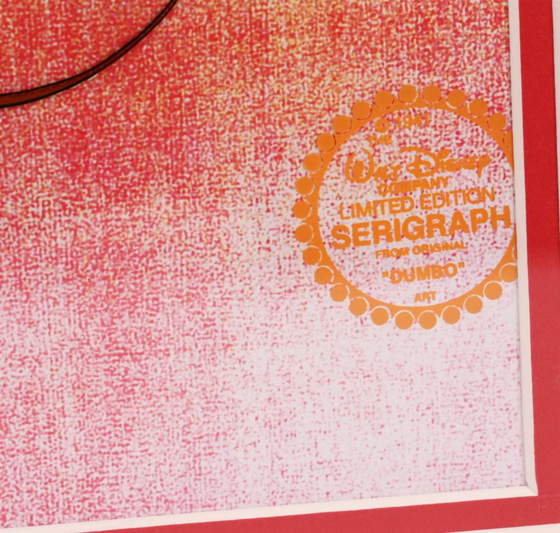 The Walt Disney Company Limited Edition Serigraph From Original "Dumbo" Art. Includes an authentication seal from Walt Disney in the lower right corner. This serigraph comes framed and measures 21" x 17.5" inches.