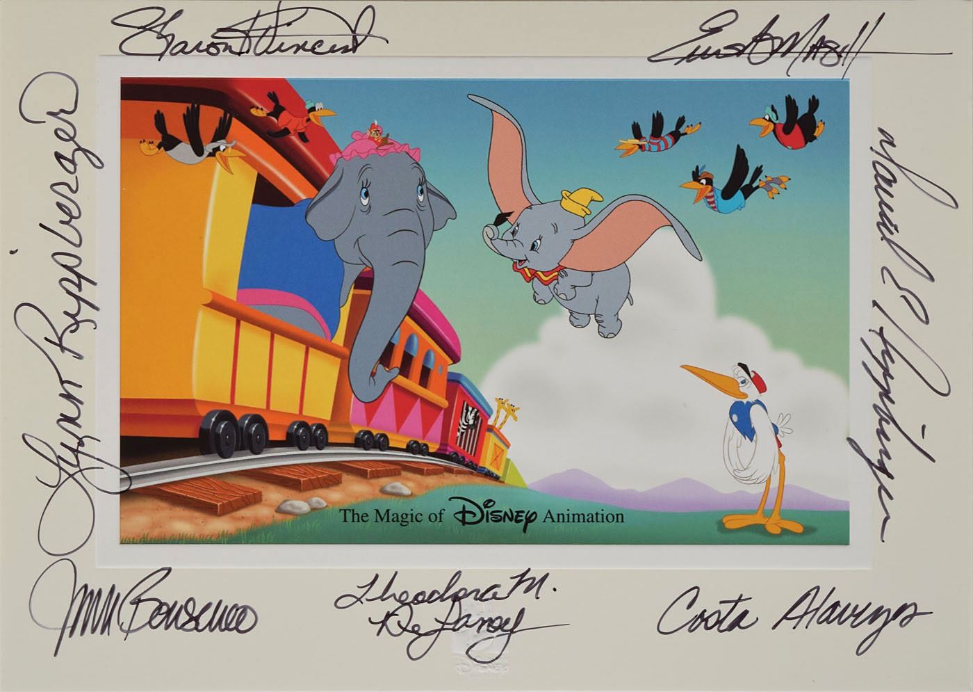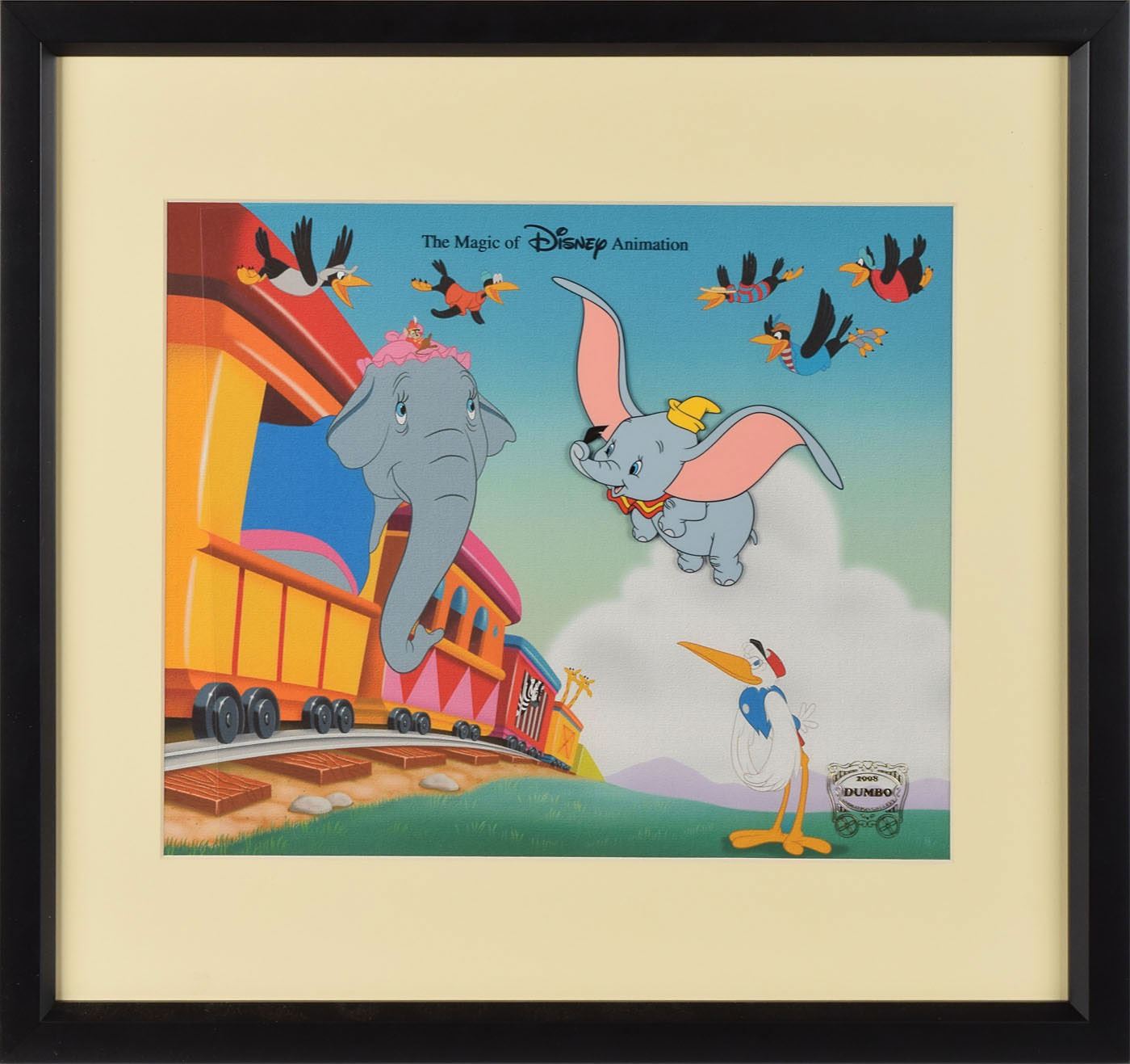 (Walt Disney Studios, 2008) Original limited edition hand-painted cel featuring Dumbo flying through the air beside a train, entitled 'Dumbo,' sold only in 2008 in the Disney-MGM Studios theme park at Disney World. This cel was painted for the 'Magic of Disney Animation' series. The cel is placed on a printed color background. Character image measures 4.5 x 4.75, with a mat opening of 12 x 10. Framed to an overall size of 17.5 x 16.5. Includes a color 7 x 5 postcard signed in black felt tip by artists Costa Alavezos, Sharon K. Vincent, James Bonserio, Erin Magill, Theodora M. DeLaney, Lynn Rippberger, and David Rippberger. In fine condition. Accompanied by certificates of authenticity from Phil Sears and Disney.