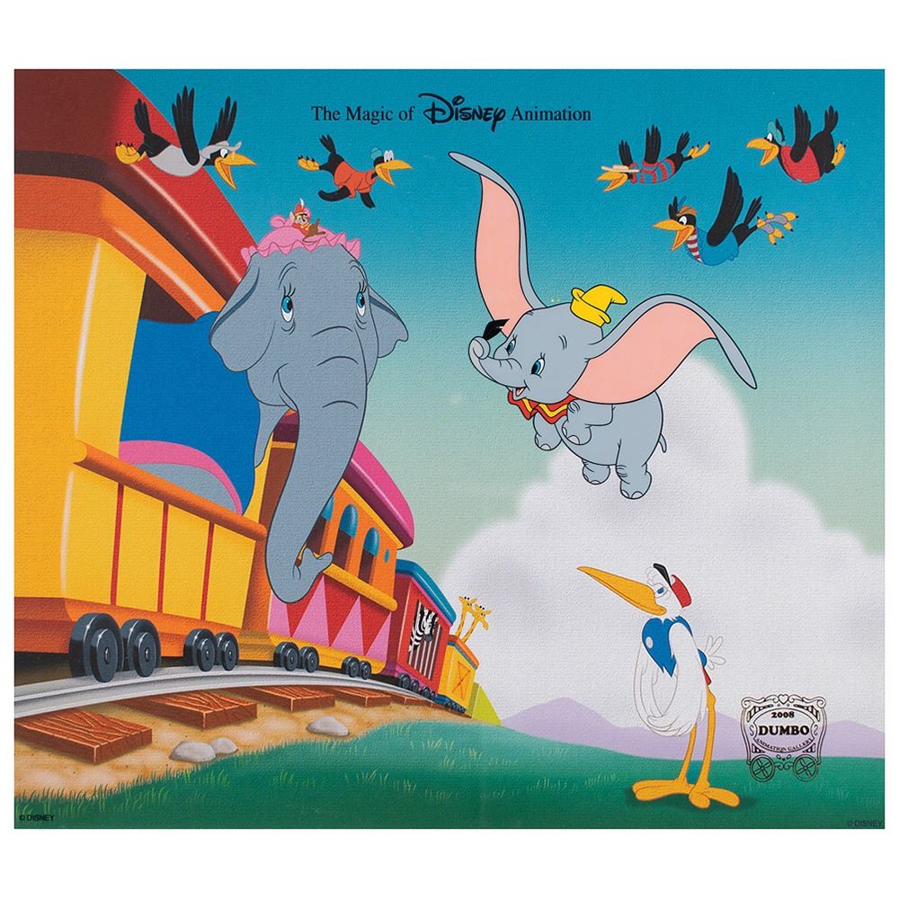 (Walt Disney Studios, 2008) Limited edition hand-painted cel featuring Dumbo flying through the air beside a train, entitled 'Dumbo,' sold only in 2008 in the Disney-MGM Studios theme park at Disney World. This cel was painted for the 'Magic of Disney Animation' series. The cel is placed on a printed Disney color background. Character image measures 4.5 x 4.75, with overall dimensions of 13 x 10.5. In fine condition.