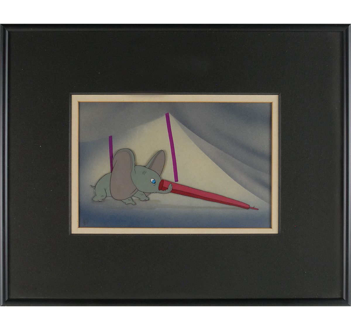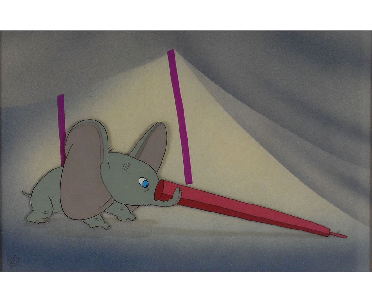 (Walt Disney Studios, 1941) Original production cel featuring Dumbo from Dumbo, showing him dragging a tent pole with his trunk. The cel has been trimmed and applied to an airbrushed background as prepared by the Disney Studio to be sold at the Courvoisier Galleries. Image measures 7 x 2.5, with a mat opening of 8 x 5.25. This piece is also framed to an overall size of 15 x 12. The piece has the original Disney Courvoisier Galleries label on the reverse. In fine condition.