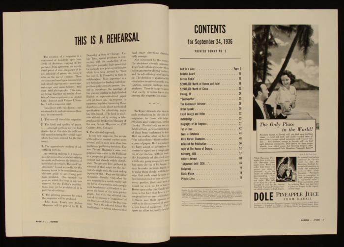 This magazine may not have its name on the cover, but it is the precursor to one of the greatest magazines of the 20th century: LIFE Magazine. This is a rare "REHEARSAL DUMMY" issue, dated September 24, 1936, just seven weeks before the inaugural issue hit the newsstands on November 23. Only 15,000 copies were printed of this final trial run, all nameless, with white cover, and red and black lettering. This one is in Near Mint condition, with only some slight marring along the spine.