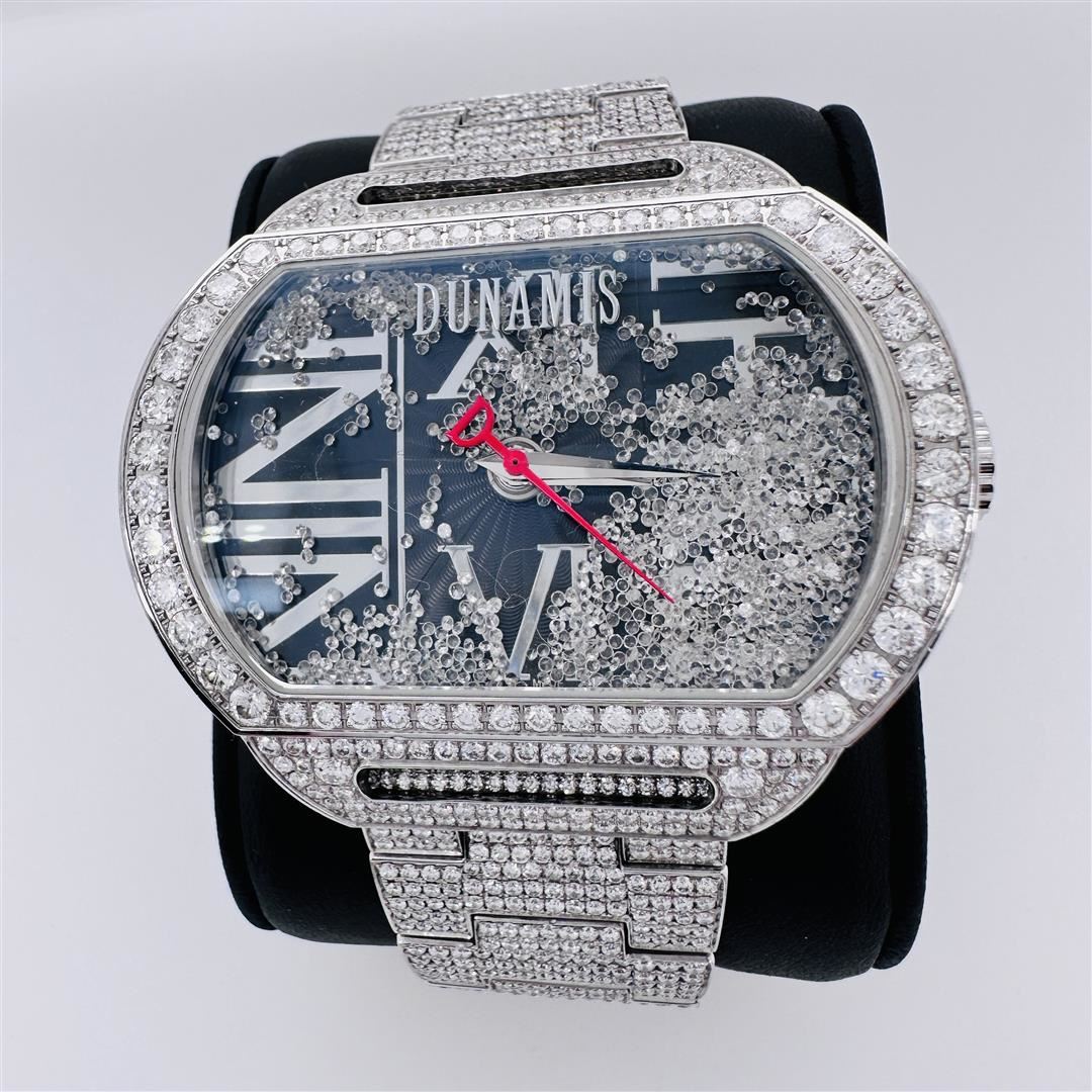DUNAMIS Stainless Steel Wrist Watch. With Floating Diamonds in the Dial. With Diamond encrusted Bezel. With Diamond encrusted Head and Sides. With Diamond encrusted Strap. With See through back to Movement. With 2744 Round Brilliant Diamonds Approximately 20.70 cts. Serial: D1171 Model: Hercules Case: 50 millimeters Crown: Twin Lock Screw Down Bezel: Stainless Steel Diamonds Crystal: Sapphire Hands: Narrow Baton Pointed, with Red Logo Second Hand Movement: Automatic Dial: Black/Logo Bracelet: Stainless Steel, Diamond Clasp: Double Deployment Weight: 185.30 grams... We've been told that similar items without diamonds on the band, have been found online for up to $38K!