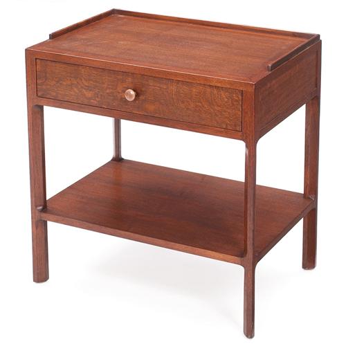 Dunbar side table, oak, rectangular form with one drawer and lower shelf on carved legs, 3/4" lip around back and side edge, finished on all sides, marked with brass "D" tag, 25"w x 16.75"d x 25.25"h, excellent condition