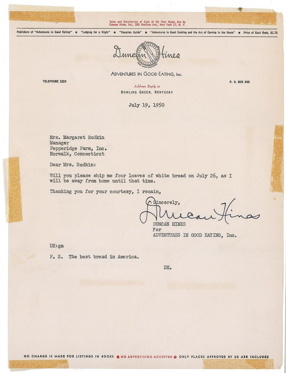 American writer (1880–1959) who pioneered restaurant ratings and who licensed his name to a number of food products, including a popular line of cake mixes. TLS, one page, 8.5 x 11, Adventures in Good Eating letterhead, July 19, 1950. A request to the manager of Pepperidge Farm. In full: “Will you please ship me four loaves of white bread on July 26, as I will be away from home until that time.” He has added the complimentary postscript, “The best bread in America.” In very good condition, with a few strips of even toning and six pieces of old tape at the edges. RRAuction COA.