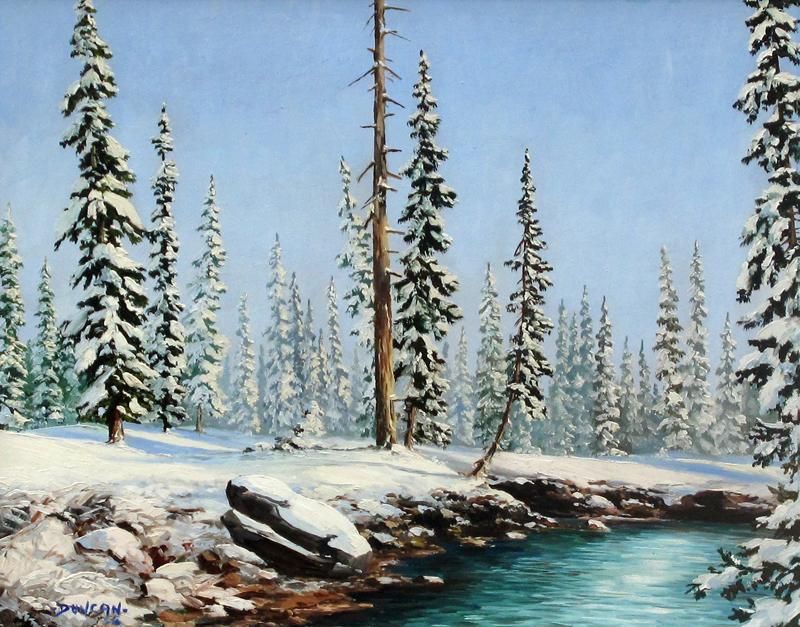 RIVER SCENE WITH SNOW-CAPPED PINES; 1956