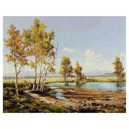 [Canadian 1920-1991] AUTUMN POND IN THE FOOTHILLS Oil on canvas 24 x 30 in. Signed.