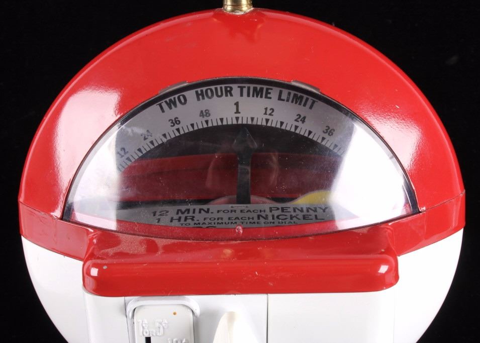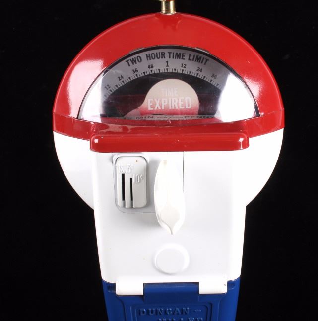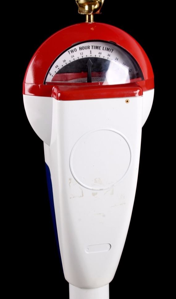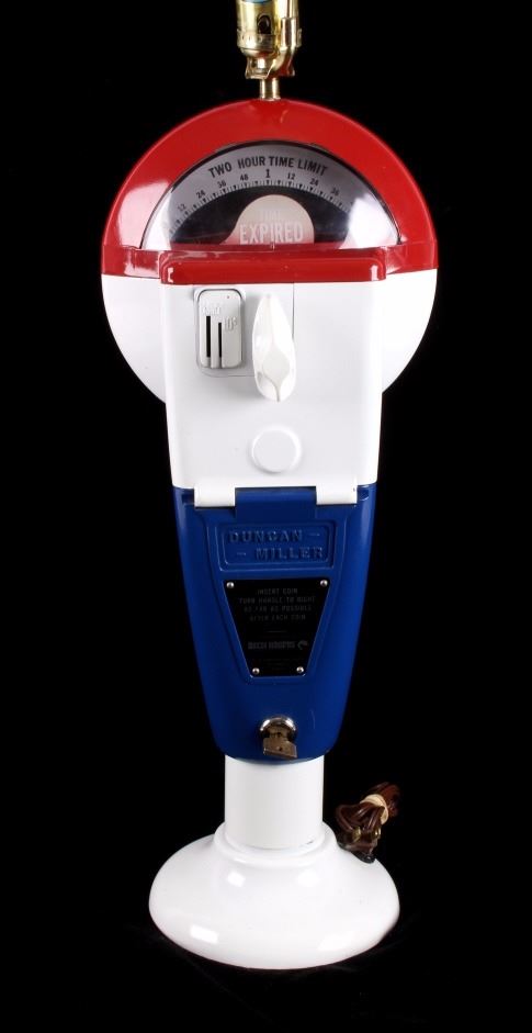 This is a Duncan Miller parking meter lamp. The lamp is made with a working parking meter. The piece has been custom painted with a patriotic design in red, white and blue. The lamp is in good condition. It has been tested and is in working condition. It measures 15" wide and 32" tall.