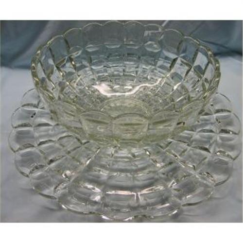Beautiful Duncan Miller Punch Bowl and Underliner Tray -- probably form the 1940s. The bowl's diamenter is 14 inches and the tray's diameter is 21 1/2 inches. There are scalloped edges on both the bowl and the underliner. It is hard to find the liner and it usually sells for more by itself than the price I am selling both pieces for. No chips or cracks - great condition. This would make a lovely addition to your home. (Home)