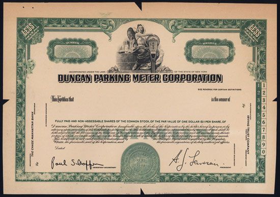 New York, 19xx (ca.1960's), <100 Shares, Stock Proof, Green print proof on light brown paper, Woman with city to her right and touching parking meter top center, VF condition, SCBNC.
