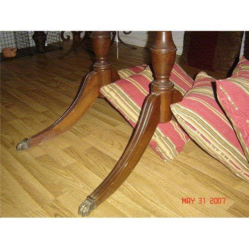 This is a beautiful Duncan Phyfe dining room table. The sides of the table fold down The legs are in excellent condition and have brass at the feet. There are minor surface scratches on the top of the table. It could be easily refinished on the top.