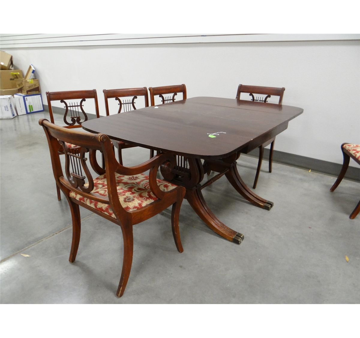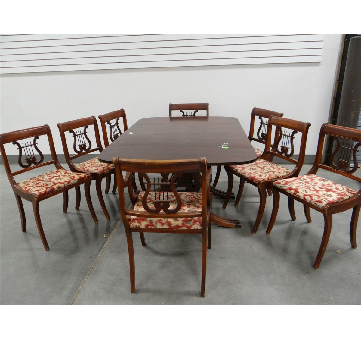 Duncan Phyfe dining table w/8 lyre-chairs, 3 leaves, nice