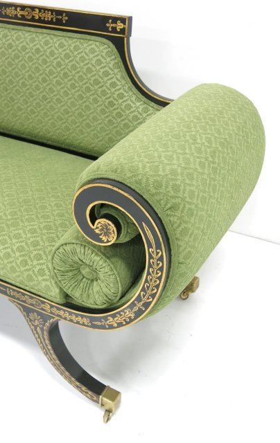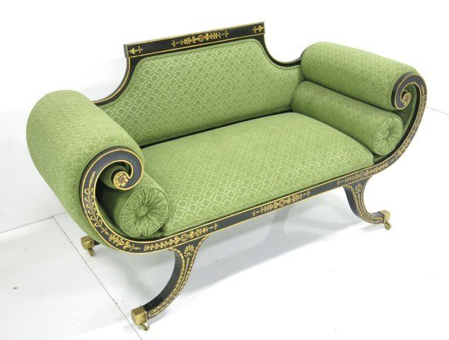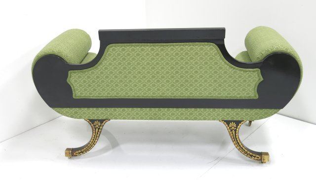 Black & gold paint decorated, green upholstery. Approx. 31.5" H (back) x 55" x 22". Purchased at Agostino's. Good condition.