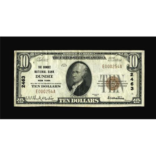 <B>Dundee, NY</B></I> - $10 1929 Ty. 1 <B>The Dundee NB</B></I> Ch. # 2463<BR> This is an exceptionally rare bank in small size, with the current census standing at just two examples, one of which is a serial number 1 note. This piece is new to that listing, and, in addition to its bank rarity, displays the printed signature of C.M. Blank, who signs as A.Cashier, the first time we have ever seen this printed designation on any Series 1929 note. Bright <B>Very Fine+.</B></I><BR><BR><b>Shipping:</b> Coins & Currency (<a target="_blank" href="http://www.heritageauctions.com/common/shipping.php">view shipping information</a>)