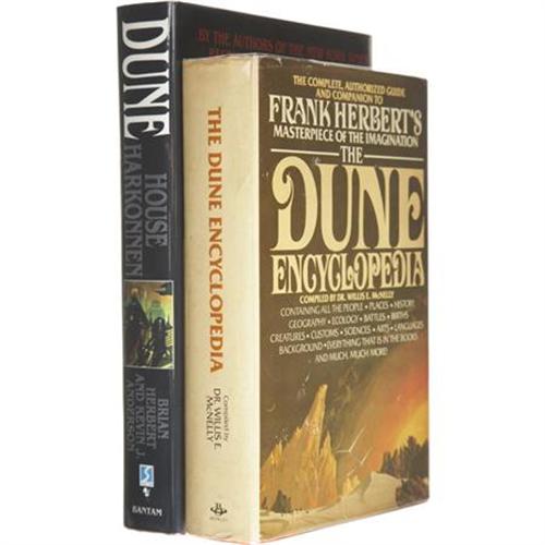 <B><I>Dune</B></I></B></I><B>: Two Hardcover Books, One Signed</B></I> <B><I>Dune Encyclopedia</B></I></B></I><B>, Compiled by Dr. Willis E. McNelly</B></I> (New York: Berkley Books, 1984), book club edition (only hardcover edition), 526 pages, untrimmed, black-and-red binding with black lettering, 8vo (8.5” x 5.5”), dust jacket (in protective cover). This complete, authorized guide to Frank Herbert’s <I>Dune</B></I> is in very good condition with minor staining on the top edge; the dust jacket is very good with minor wear.<BR><B>Brian Herbert and Kevin J. Anderson: Signed </B></I><B><I>Dune: House Harkonnen</B></I></B></I> (New York: Bantam Books, 2000), first edition, 603 pages, maps, black binding with silver lettering, 8vo (9.5” x 6.25”), dust jacket (in protective cover). <I>House Harkonnen</B></I> is the second of nine prequels and sequels to Frank Herbert’s <I>Dune</B></I> written by his eldest son, Brian (b. 1947), and Kevin J. Anderson, both acclaimed science-fiction authors. Both authors have signed in full above their names on the title page. The book and dust jacket are in fine condition.<BR><BR><b>Shipping:</b> Books & Catalogs (<a target="_blank" href="http://www.heritageauctions.com/common/shipping.php">view shipping information</a>)