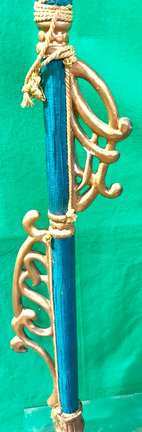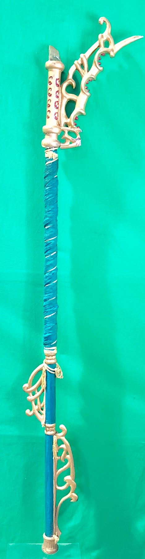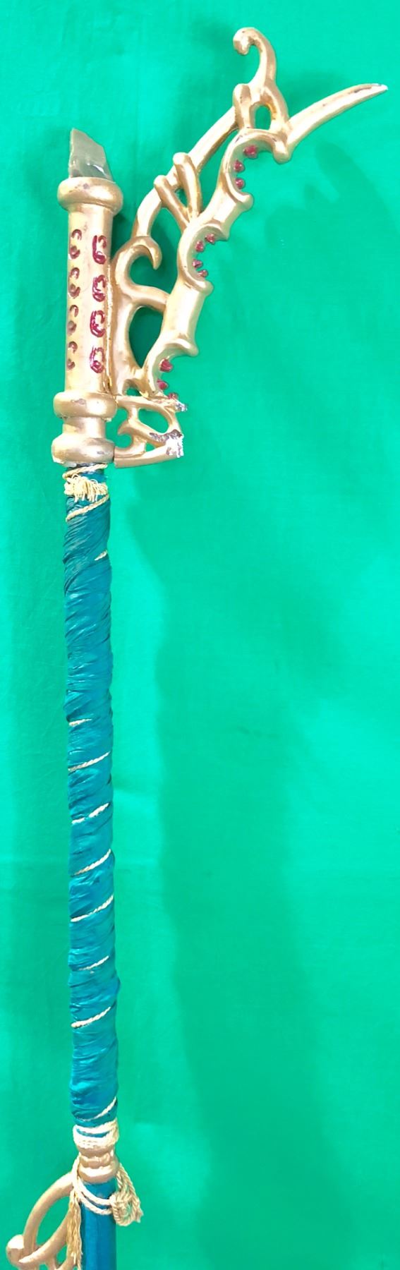 Original production used Mage sceptre used in the big film ending Dragon attack and the great hall scenes in the fantasy film "Dungeons Dragons" (2000), based on the Dungeons Dragons role-playing game, where Profion, a tyrant, attempts to overthrow a peaceful kingdom ruled by a tough empress. Starring Justin Whalin, Jeremy Irons, Marlon Wayans, Thora Birch and Tom Baker. Made of wood core with resin/fabric etc to create the look. Measuring roughly 69" tall with production use ware.