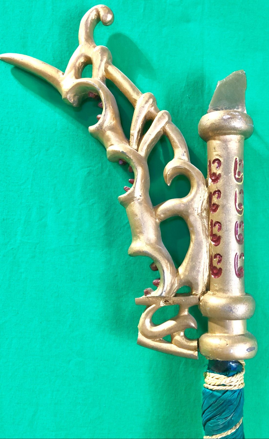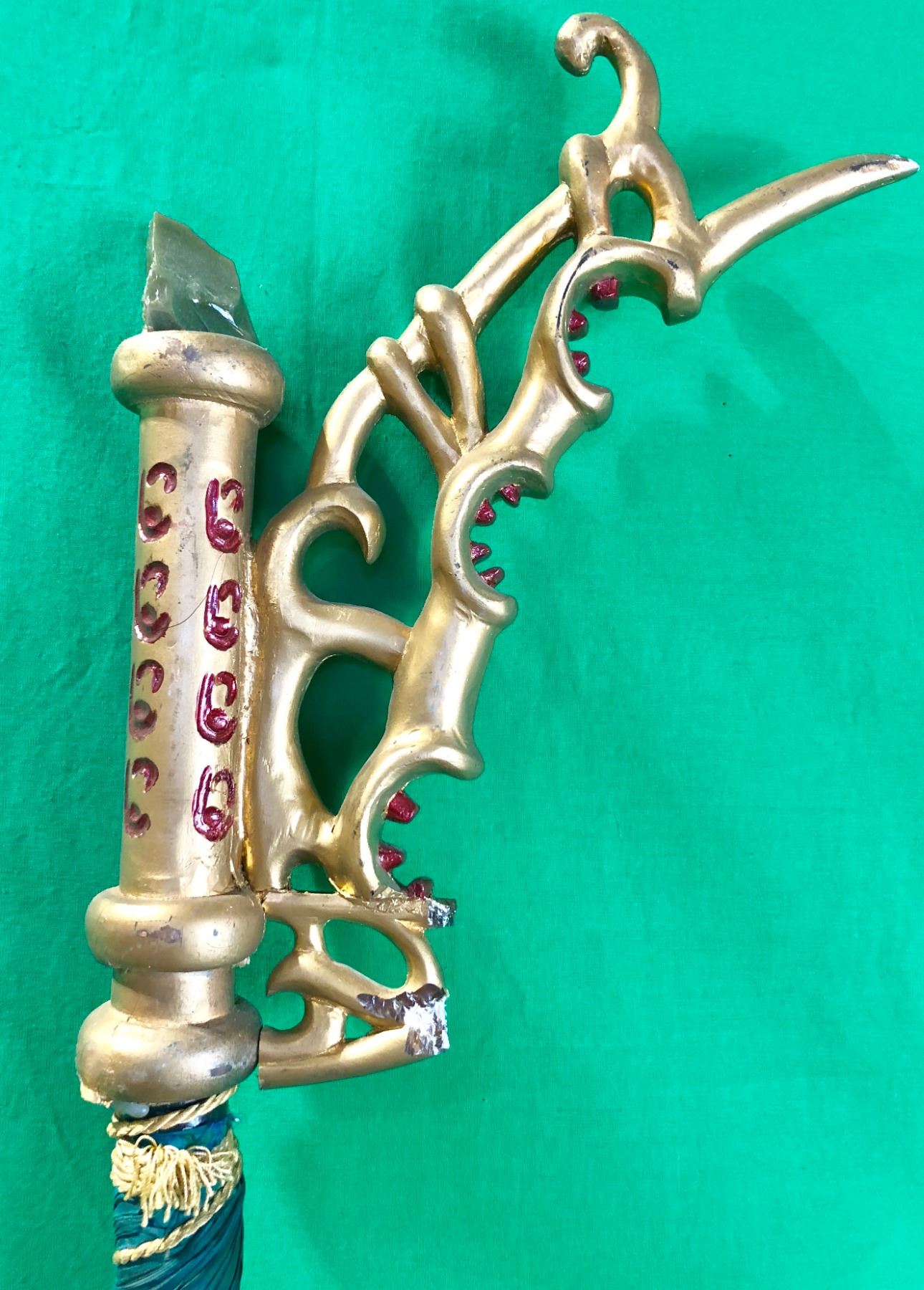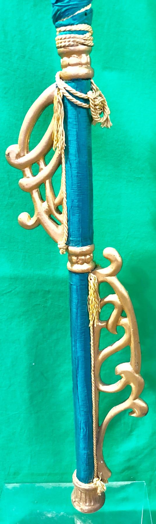 Original production used Mage sceptre used in the big film ending Dragon attack and the great hall scenes in the fantasy film "Dungeons Dragons" (2000), based on the Dungeons Dragons role-playing game, where Profion, a tyrant, attempts to overthrow a peaceful kingdom ruled by a tough empress. Starring Justin Whalin, Jeremy Irons, Marlon Wayans, Thora Birch and Tom Baker. Made of wood core with resin/fabric etc to create the look. Measuring roughly 69" tall with production use ware.
