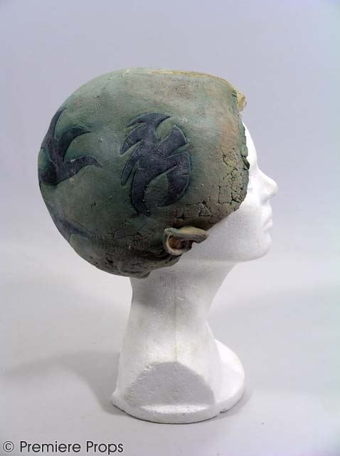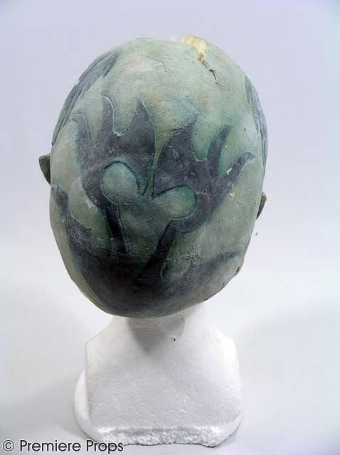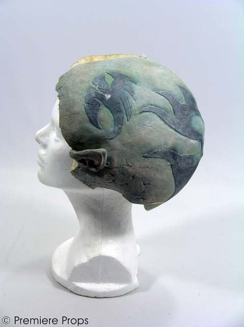 DUNGEONS & DRAGONS – Klaxx's Screenworn Split Head Piece – The top portion of Klaxx's headpiece, screenworn in the fantasy epic “Dungeons & Dragons: Wrath of the Dragon God,” based on the famous role-playing game “Dungeons & Dragons!” The latex prosthetic head features a foam core, heavily detailed bird and flame-like designs painted in dark blue throughout the greenish-blue head. The head piece is heavily studio-aged and worn from its use on set, and appears to have been torn open in the front.