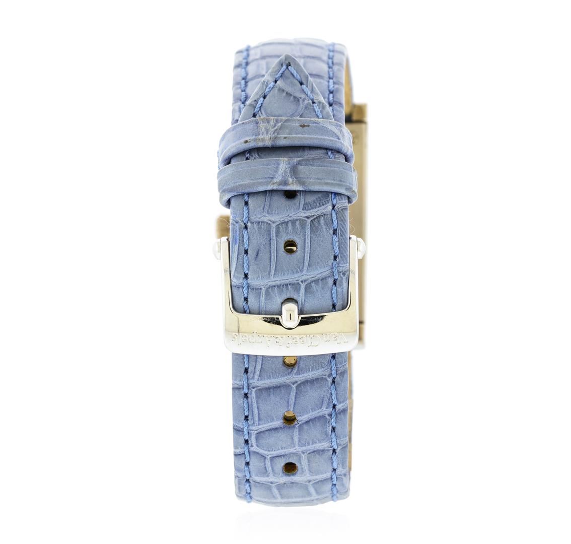 One, Dunhill wristwatch electronically tested 18KT White gold, Case: 33 x 18mm, Swiss Hallmarked Water Resistant: 30 meters / 100 feet, Case Back, secured by four set screws, engraved with the manufacturers name, and information, Crown: scalloped, Bezel: diamond set, Crystal: beveled synthetic sapphire lens, Movement: quartz. Dunhill signed Dial: dark mother of pearl, with pointed hands, and four raised diamond markers, Chopard Bracelet: Light Blue saddle stitched leather strap, Condition: G-5 Fine. Seven inch length, adjustable. Swiss Hallmarked Van Cleef & Arpels White gold filled buckle. Containing: Eighteen channel set baguette cut diamonds, measuring from 3.40 x 1.50 x 1.05mm (depth est.) to 3.90 x 1.50 x 1.05mm (depth est.) approximate total weight of 18 Stones = 0.95ct. Clarity: VVS-1 to VS-1 Color F - G Four prong set baguette cut diamonds, measuring 2.40 x 1.20 x 0.84mm (depth est.) approximate total weight of 4 Stones = 0.08ct. Graded in the setting. Clarity: VVS-2 to VS-1 Color F - G. Total Weight of Diamonds 1.03ct. Total Weight of Watch 39.59gm. AIG Appraised at $12,000.00.