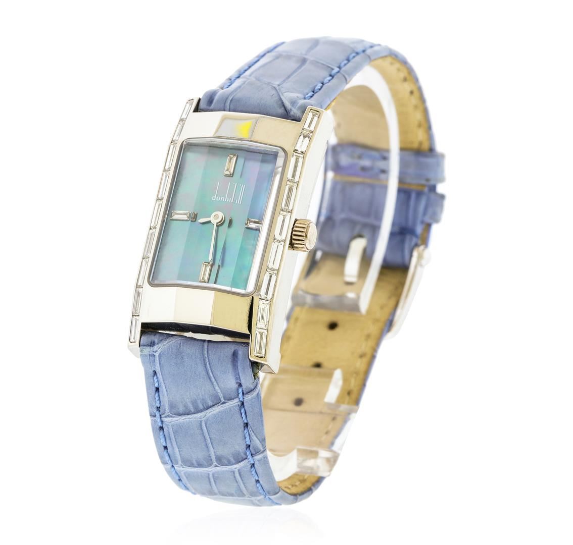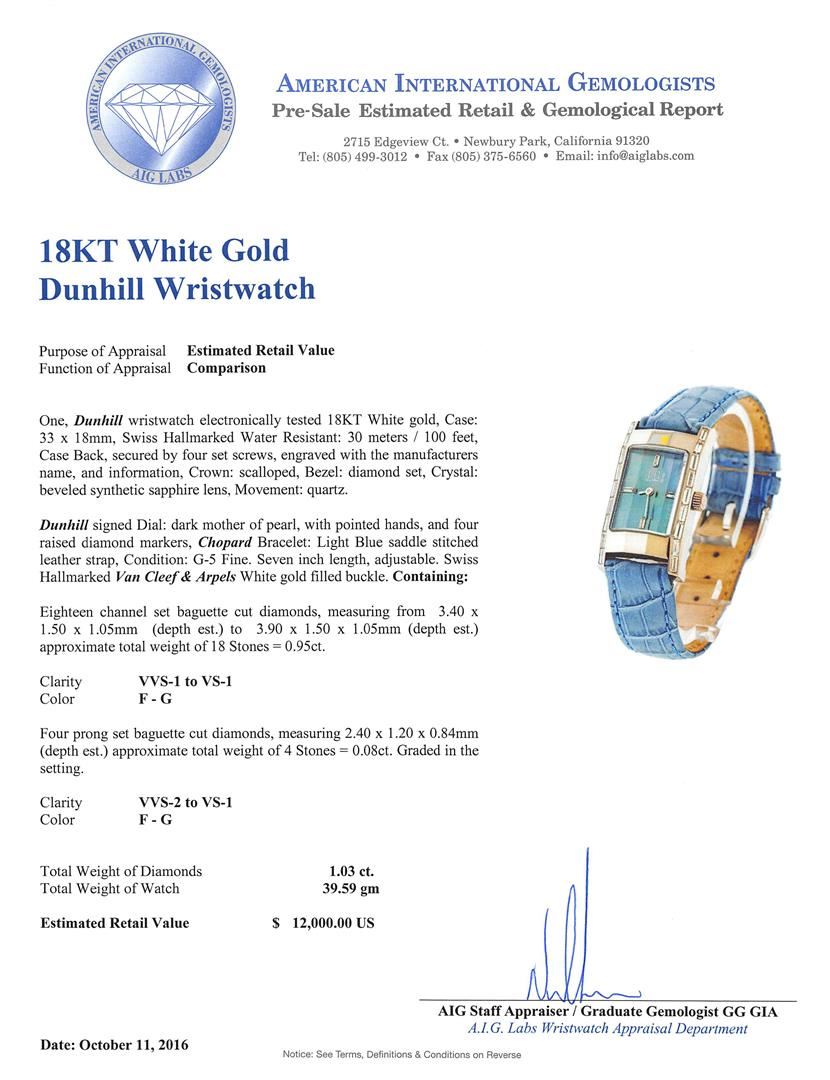 One, Dunhill wristwatch electronically tested 18KT White gold, Case: 33 x 18mm, Swiss Hallmarked Water Resistant: 30 meters / 100 feet, Case Back, secured by four set screws, engraved with the manufacturers name, and information, Crown: scalloped, Bezel: diamond set, Crystal: beveled synthetic sapphire lens, Movement: quartz. Dunhill signed Dial: dark mother of pearl, with pointed hands, and four raised diamond markers, Chopard Bracelet: Light Blue saddle stitched leather strap, Condition: G-5 Fine. Seven inch length, adjustable. Swiss Hallmarked Van Cleef & Arpels White gold filled buckle. Containing: Eighteen channel set baguette cut diamonds, measuring from 3.40 x 1.50 x 1.05mm (depth est.) to 3.90 x 1.50 x 1.05mm (depth est.) approximate total weight of 18 Stones = 0.95ct. Clarity: VVS-1 to VS-1 Color F - G Four prong set baguette cut diamonds, measuring 2.40 x 1.20 x 0.84mm (depth est.) approximate total weight of 4 Stones = 0.08ct. Graded in the setting. Clarity: VVS-2 to VS-1 Color F - G. Total Weight of Diamonds 1.03ct. Total Weight of Watch 39.59gm. AIG Appraised at $12,000.00.