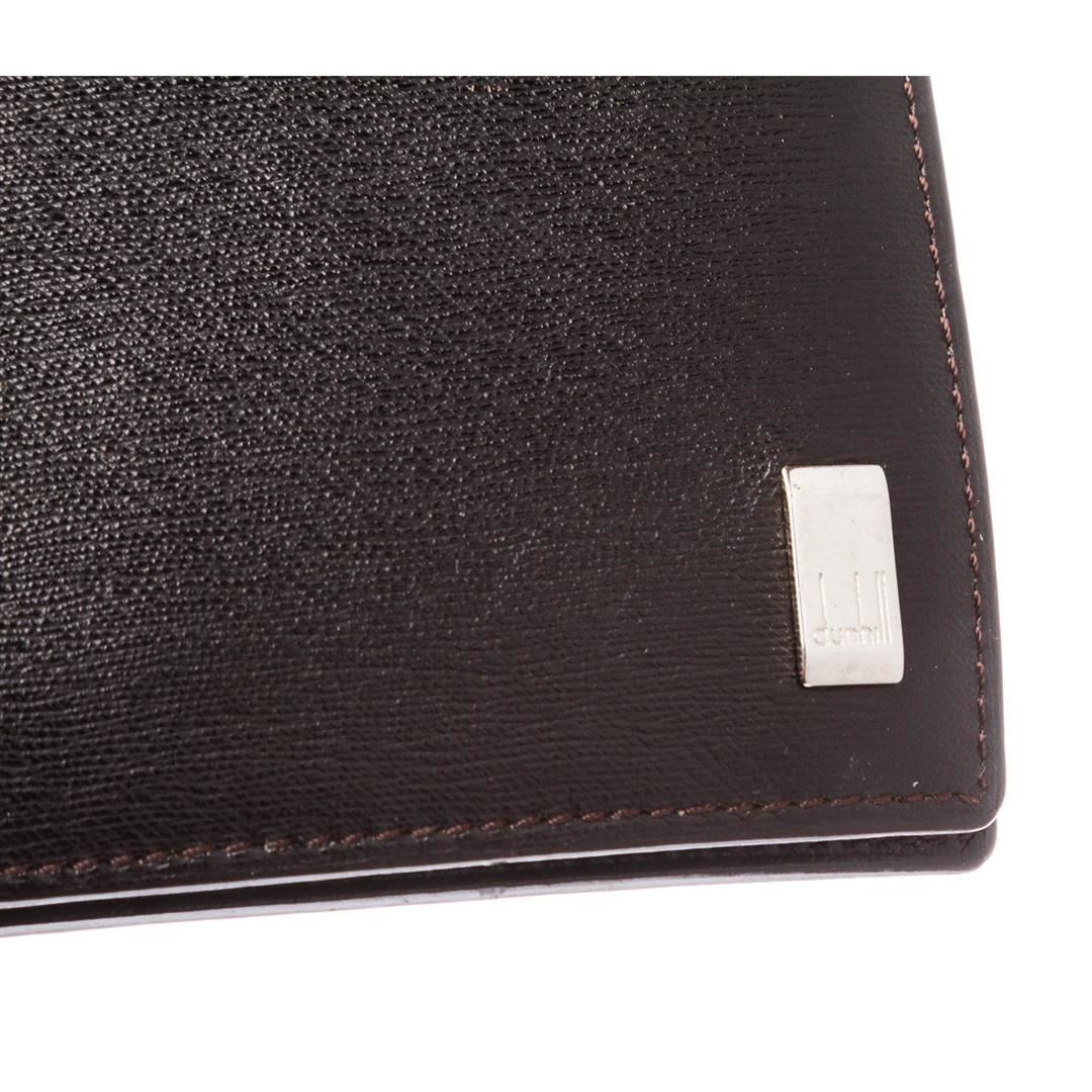 Dun Hill black leather bi fold wallet. Inner four card slot, money slip pocket, snap closure change pocket and leather lining. Item is pre-owned. Item Dimensions: L 4.75"xH 3.75"/12.06cmx9.52cm.