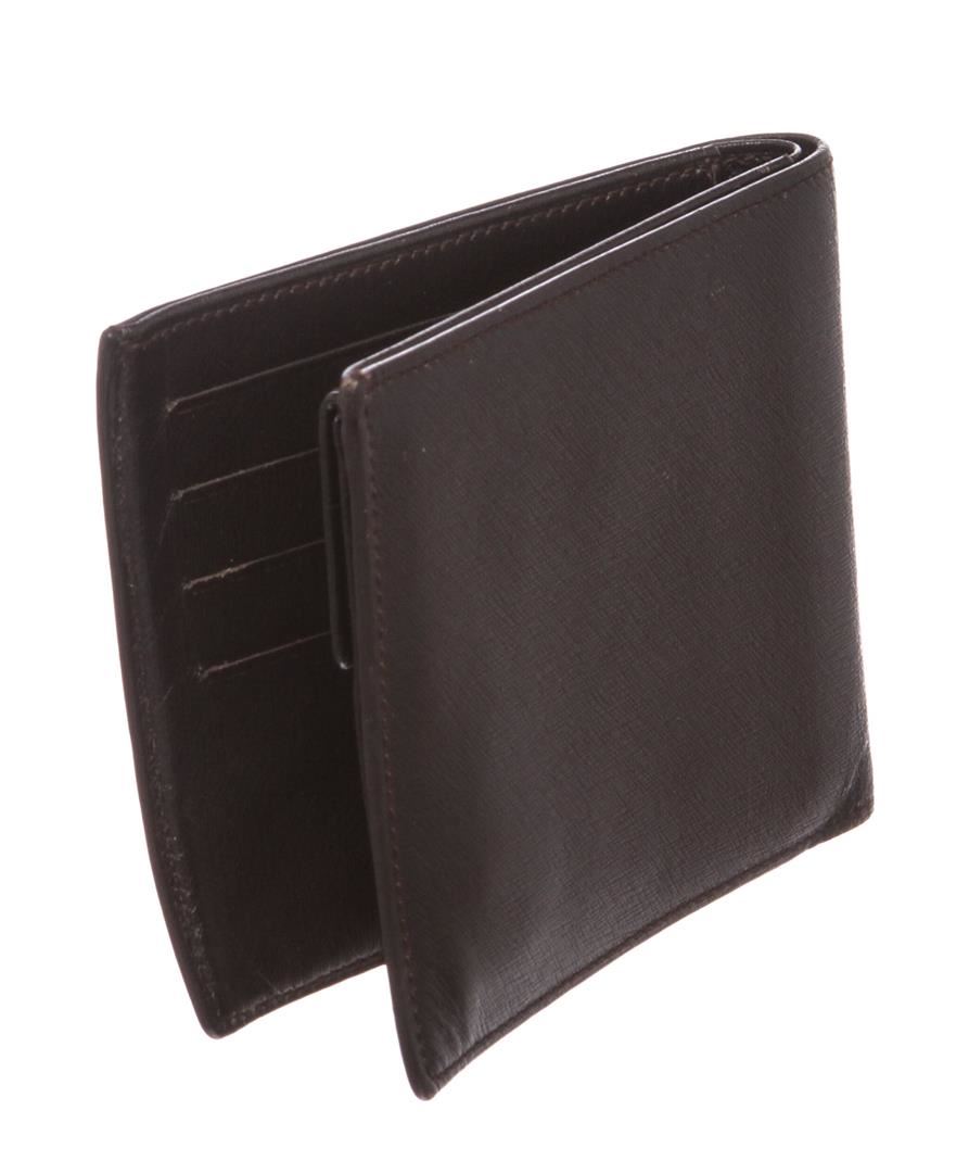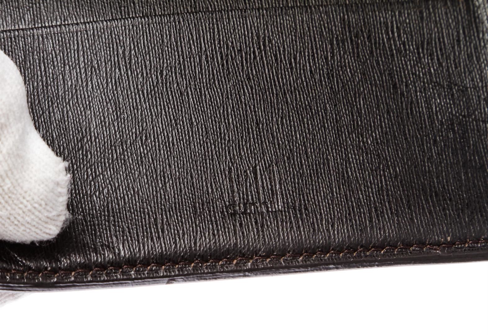 One Dunhill Black Leather Bi Fold Wallet. Dunhill black leather bi fold wallet. Inner four card slot, money slip pocket, snap closure change pocket and leather lining.