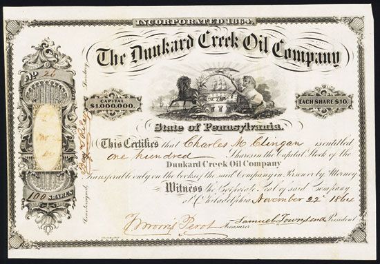 Pennsylvania, 1864, 100 Shares, Issued and Uncancelled Stock, #26, Black print with black ornate border, Vignette top center of two horses flanking Pennsylvania crest with ocean on left and locomotive moving over bridge on right, VF-XF condition but the adhesive revenue stamp has fallen off, Printer: J. Haehnlen. Signed by Thomas Morris Perot as treasurer. He is the grandson of Elliston Perot, a noted Philadelphia merchant, and a descendant of Anthony Morris. He early entered the retail drug business and graduated at the Philadelphia college of pharmacy. In 1850, he established himself in business as a wholesale druggist and manufacturing chemist. He is widely known for his philanthropic works. In 1861 he was the president of the Mercantile library company. Mr.Perot also bore an active part in founding the Woman's medical college in Philadelphia.