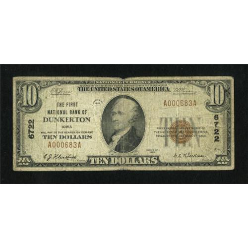 <B>Dunkerton, IA</B></I> - $10 1929 Ty. 1 <B>The First NB</B></I> Ch. # 6722<BR> Thanks to the pioneering efforts of some dedicated collectors of Iowa nationals, the census of small size notes on this bank now stands at thirteen. However, most of them must be tightly held as there have very few auction appearances. Here is an opportunity to acquire a well circulated <B>Very Good</B></I> on this bank.<BR><BR><b>Shipping:</b> Coins & Currency (<a target="_blank" href="http://www.heritageauctions.com/common/shipping.php">view shipping information</a>)