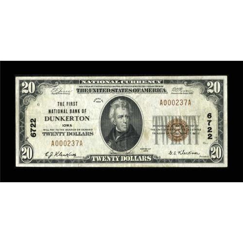 <B>Dunkerton, IA</B></I> - $20 1929 Ty. 1 <B>The First NB</B></I> Ch. # 6722<BR> Embossing is noticed on this $20 from this tougher one bank community. This note bears the signatures of E.J. and G.S. Kleckner. <B>Very Fine</B></I>.<BR><BR><b>Shipping:</b> Coins & Currency (<a target="_blank" href="http://www.heritageauctions.com/common/shipping.php">view shipping information</a>)