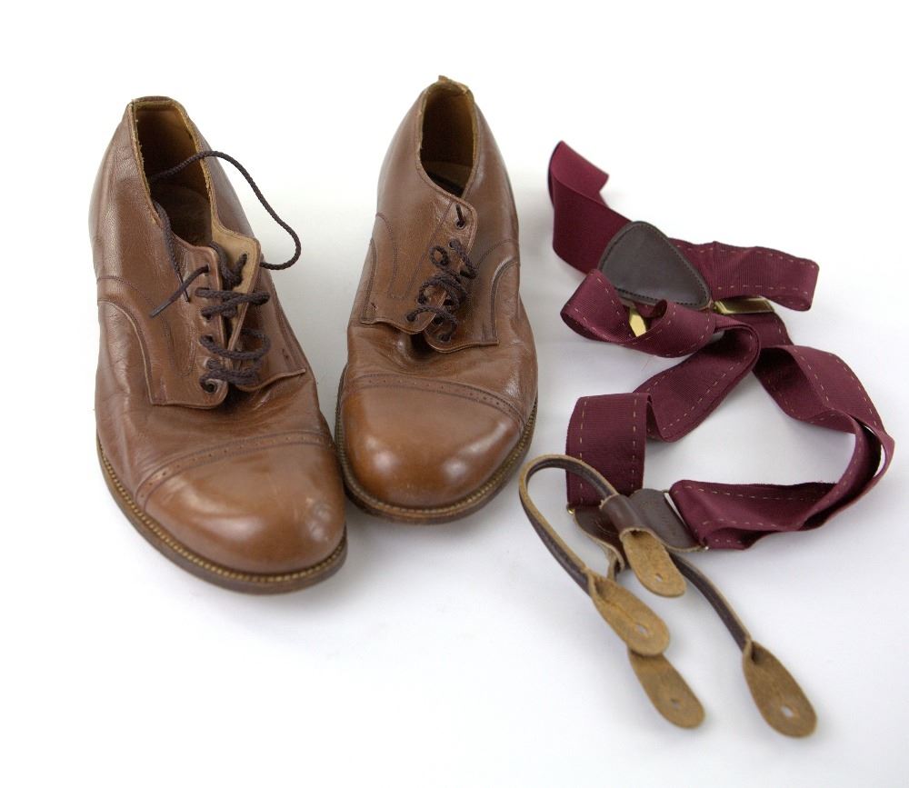 Dunkirk (2017) - Mark Rylance as Mr Dawson, production made part costume comprising pale brown tweed blazer jacket and matching waistcoat and trousers, together with a burgundy dungaree strap and pair of brown leather shoes. The blazer with Western Costume barcode (40147300) and ink inscriptions to inside. The trousers with inscribed Western Costume Co label (No. 635-1, Waist 38), barcode (40119430) and ink inscriptions within. The strap with Western Costume barcode label (40395427) attached. The shoes with Western Costume Co ink inscriptions to interior.