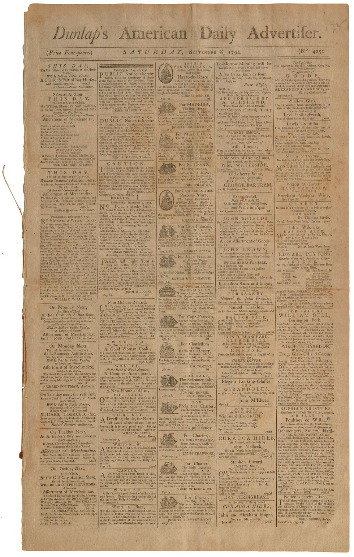 Complete issue of Dunlap's American Daily Advertiser from September 8, 1792, printed by John Dunlap, Philadelphia, four pages, 12.25 x 19.75, featuring various ads and notices for sales, auctions, ships, and employment opportunities. One advertisement is for Mathew Carey's proposal for "Publishing by Subscription, An American Edition of Guthrie's Geography Improved," and a real estate ad offers "A Lot of Ground…situate near to where the Building is now erecting for the Residence of the President of the United States, and is in an improving part of the city." In fine condition, with light soiling and some chipping to edges. John Dunlap began the publication of the weekly Pennsylvania Packet in 1771, and in 1784 it became the first successful daily newspaper in America; its name was changed to Dunlap's American Daily Advertiser in 1791. Dunlap is also known as the publisher of the first copies of the Declaration of Independence in 1776.