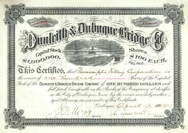 1905. Iowa. Stock certificate. Black/White. Vignette of bridge at top center. Signed as president by STUYVESANT FISH. Cut cancelled at signature. Very fine.