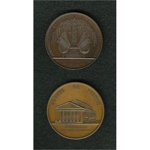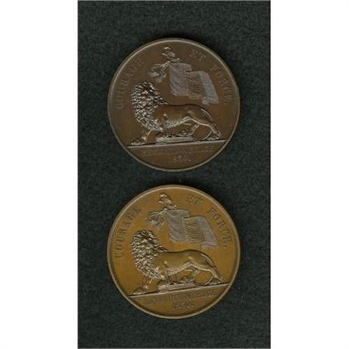 <B>Duo of Belgian Medals.</B></I> 1830 Belgian bronze medal commemorating the revolution against Holland, no engraver's name, 48 mm; and a 48-mm bronze medal commemorating the erection of a monument in honor of the revolt in 1830.<BR><BR><b>Shipping:</b> Coins & Currency (<a target="_blank" href="http://www.heritageauctions.com/common/shipping.php">view shipping information</a>)