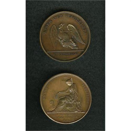 <B>Duo of Swedish Medals.</B></I> Includes: <B>1756 (1826) bronze medal</B></I> commemorating the 70th birthday of the Swedish poet Leopolds, 43 mm; and <B>1818 bronze medal </B></I>of poet Adlerbeth, by Salmson.<BR><BR><b>Shipping:</b> Coins & Currency (<a target="_blank" href="http://www.heritageauctions.com/common/shipping.php">view shipping information</a>)