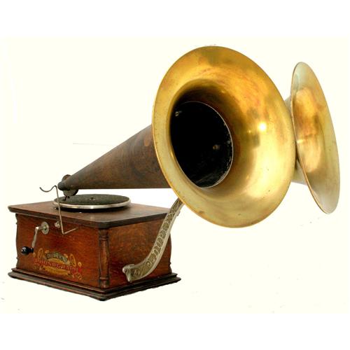 Duplex Phonograph - Oak case and brass horns in original unrestored condition. Decal visible on case. Case measures approximately 9" x 12" x 18" W. Nickel horn support with Duplex written on it.