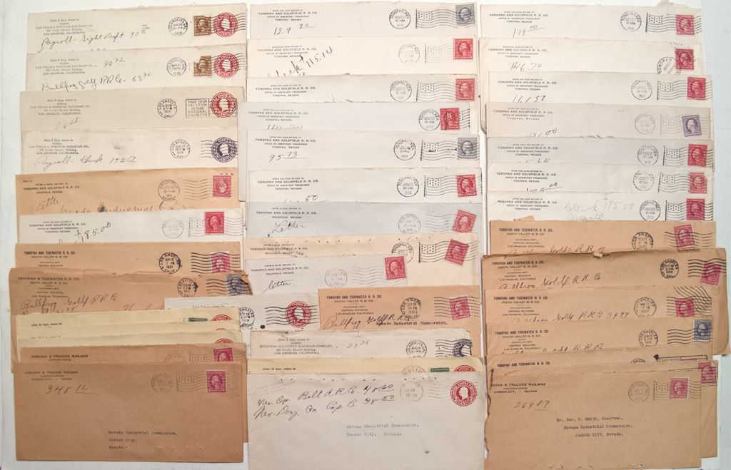 Forty-three pieces. Includes Las Vegas & Tonopah (4), Tonopah & Goldfield (18), Tonopah & Tidewater / Death Valley RR (9), Bullfrog Goldfield (2), Nevada Central (5), Virginia & Truckee Railway (4), Nevada Copper Belt (1).