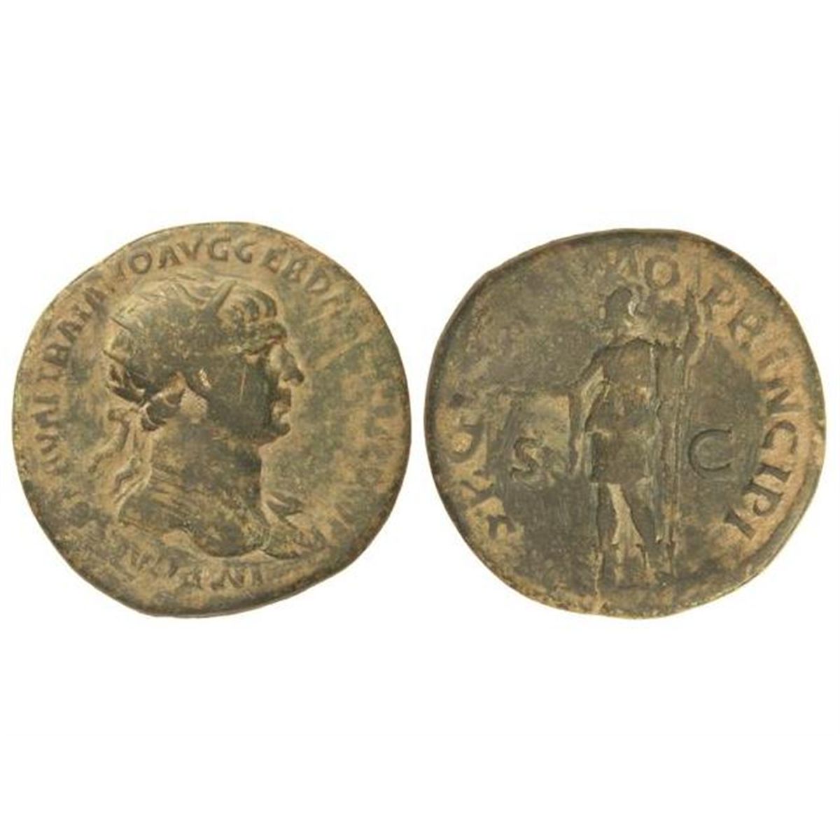 ROMAN COINS: ROMAN EMPIRE - Dupondio. - Acuñada el 104-110 d.C. - TRAJANO. - Anv.: IMP. CAES. NERVAE TRAIANO AVG. GER. DAC. P. M. TR. P. COS. V P. P. Busto radiado a derecha. Rev.: S. P. Q. R. (OPTIM)O PRINCIPI S. C. Roma en pie a izquierda, con lanza y Victoria. 13 grs. Pátina verde. C-385. BC+. - -