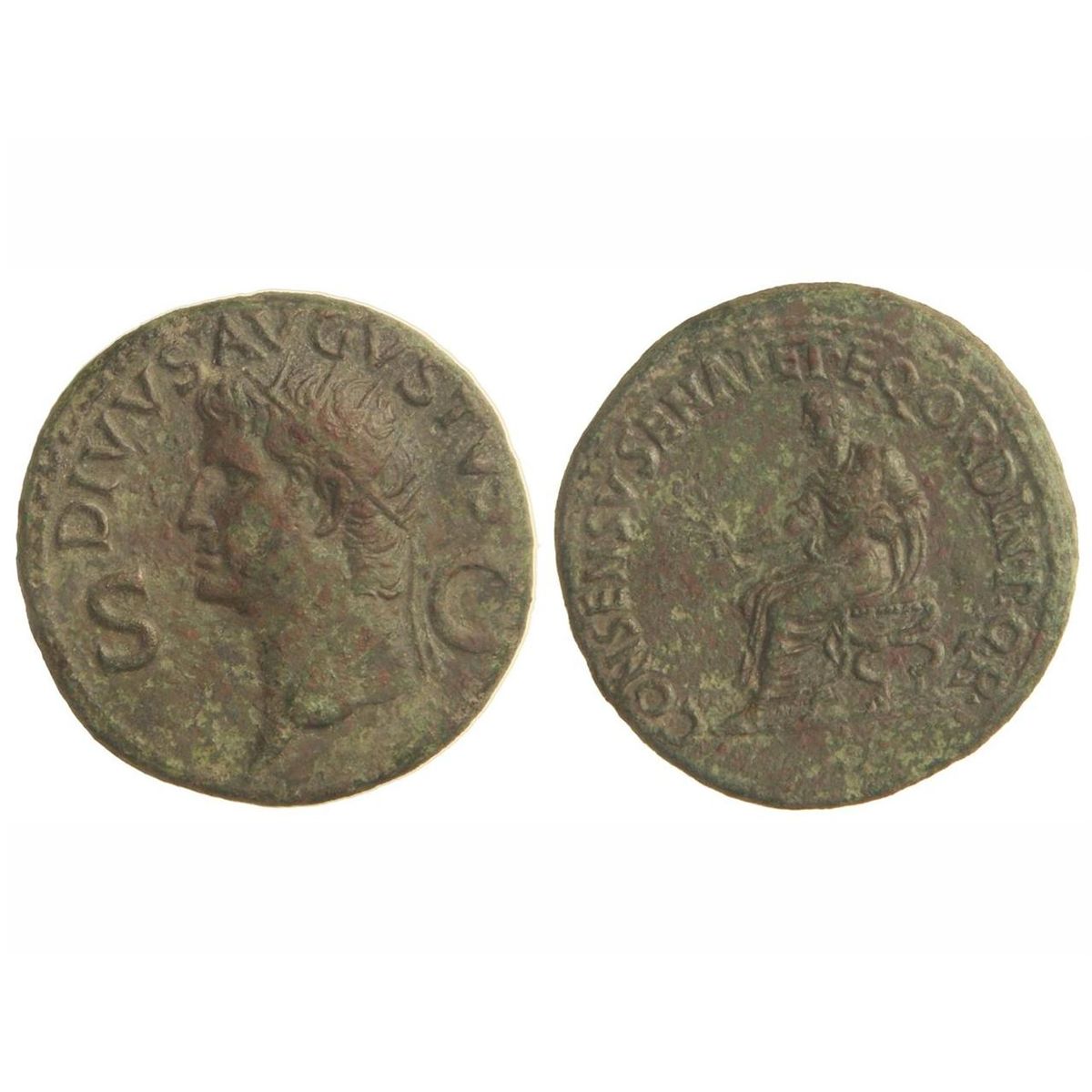 Dupondio. - Acuñada el 37-41 d.C. - AUGUSTO. Restitución de Calígula. - Anv.: DIVVS AVGVSTVS S. C. Cabeza radiada a izquierda. Rev.: CONSENSV SENAT. ET EQ. ORDIN. P. Q. R. Augusto sentado a izquierda. 15,06 grs. Pátina verde rojiza. MAGNÍFICO EJEMPLAR. C-87. EBC-. - -
