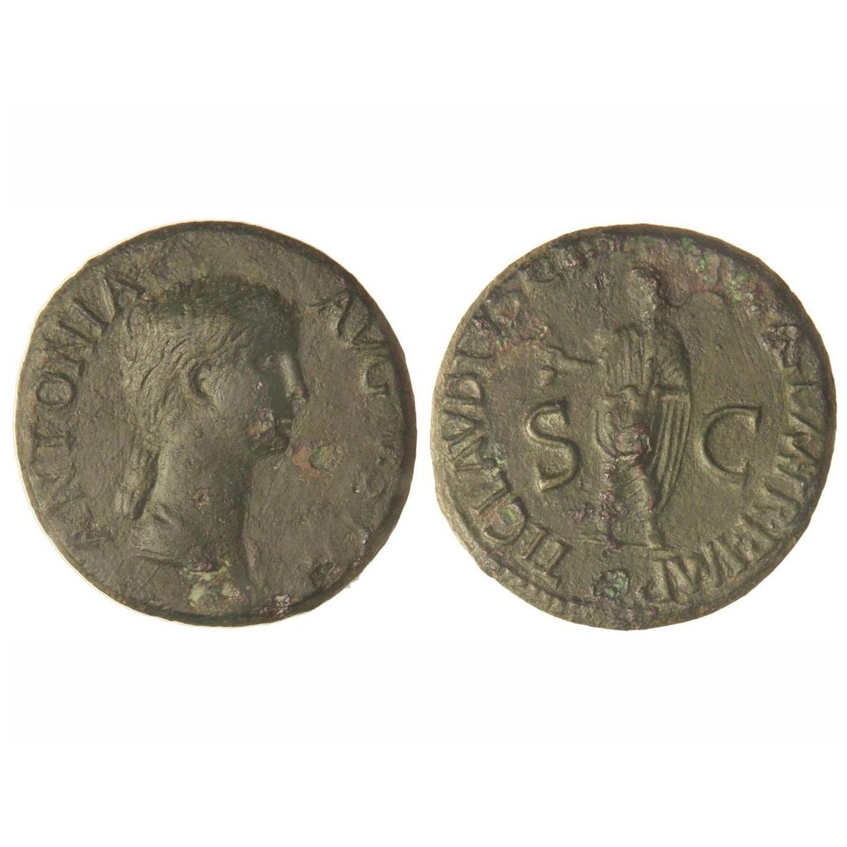 Dupondio. - Acuñada el 41-42 d.C. - ANTONIA. - Anv.: ANTONIA AVGVSTA. Busto descubierto a derecha. Rev.: TI. CLAVDIVS CAESAR AVG. P. M. TR. P. IMP. S. C. Claudio en pie a izquierda. 15,30 grs. Pátina verde. (Pequeñas oxidaciones). C-6. MBC. - -