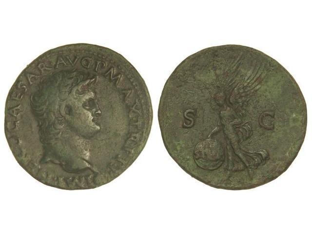 Dupondio. - Acuñada el 54-68 d.C. - NERÓN. - Anv.: IMP. NERO CAESAR AVG. P. MAX. TR. P. P. P. Cabeza a derecha. Rev.: S. C. Victoria a izquierda portando un escudo con inscripción S. P. Q. R. 13,90 grs. Pátina verde. (Golpecitos). C-303 car. cabeza a derecha. MBC+/MBC. - -
