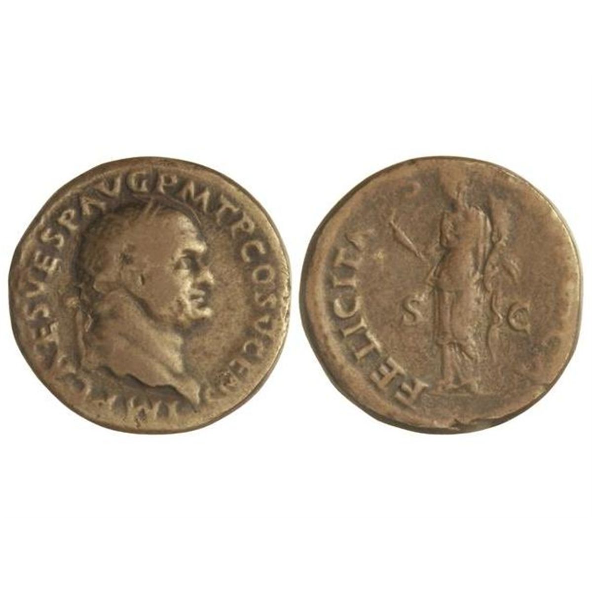 ROMAN COINS: ROMAN EMPIRE - Dupondio. - Acuñada el 70-79 d.C. - VESPASIANO. - Anv.: IMP. CAES. VESP. AVG. P. M. T. P. COS. V CENS. Busto radiado a derecha. Rev.: FELICITAS (PVBLICA) S. C. Felicidad en pie a izquierda. 12,20 grs. MBC-. - -