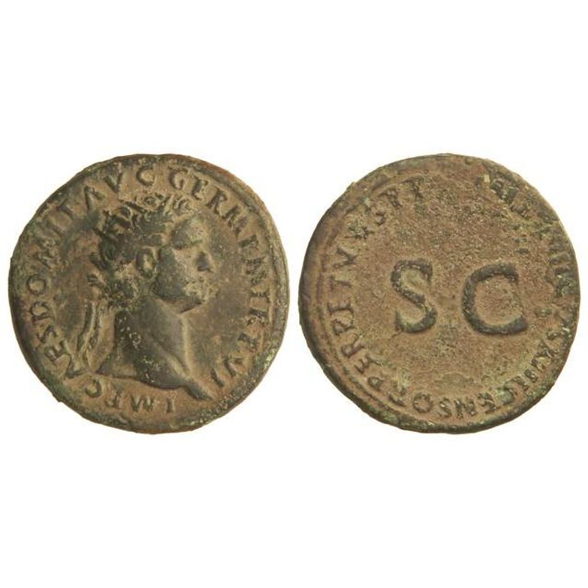 Dupondio. - Acuñada el 87 d.C. - DOMICIANO. - Anv.: IMP. CAES. DOMIT. AVG. GERM. P. M. TR. P. VI. Cabeza radiada a derecha. Rev.: (IMP. XIIII) COS. XIII. CENSOR PERPETVVS P. P. - S. C. -. 12,7 grs. Pátina verde oscuro. (Ligeras oxidaciones). C-236. MBC-. - -