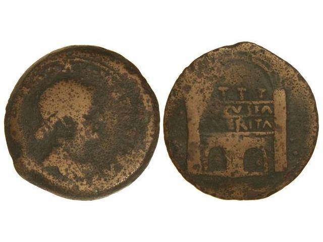 Dupondio. - ÉPOCA DE TIBERIO. - EMERITA. - Anv.: (PERM. AVGVSTI SALVS. AVGVSTA). Cabeza de Livia a derecha. Rev.: AUGUSTA EMERITA. Puerta. 23,90 grs. AB-1025. BC-/BC+. - -