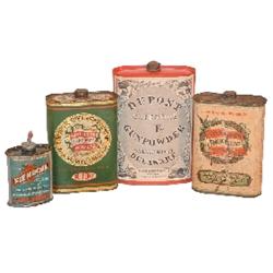 Dupont Gunpowder, Laflin & Rand Smokeless Powder & Fiendoil Firearms Cleaner tins, 2 w/paper labels, Good to Exc. condition, 4" to 6.5"H.