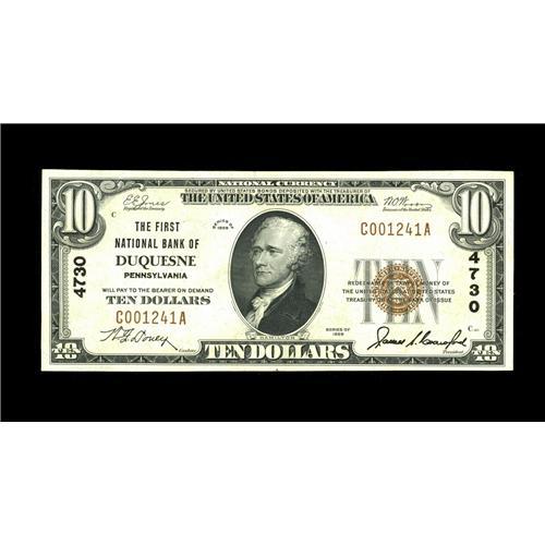 Duquesne, PA - $10 1929 Ty. 1 The First NB Ch. # 4730T Duquesne, PA
