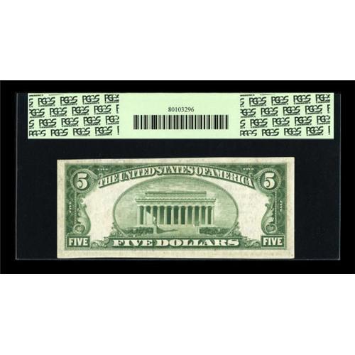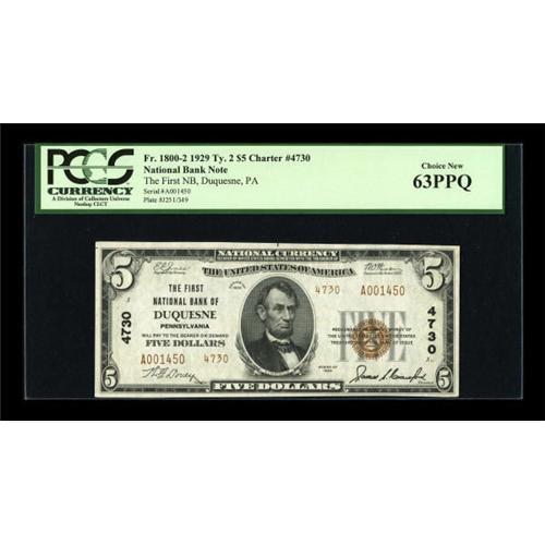 <B>Duquesne, PA</B></I> - $5 1929 Ty. 2 <B>The First NB</B></I> Ch. # 4730<BR> A little tightness in the margins at lower right keeps this note from the gem grade. <B>PCGS Choice New 63PPQ</B></I>.<BR><I>From The Kansas City Collection.</B></I><BR><BR><b>Shipping:</b> Coins & Currency (<a target="_blank" href="http://www.heritageauctions.com/common/shipping.php">view shipping information</a>)
